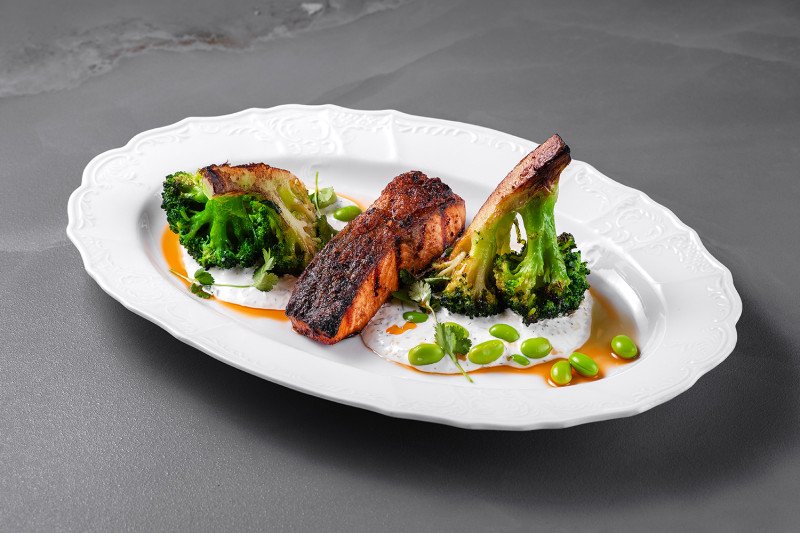 Семга, приготовленная на гриле. Подается с жаренной брокколи и соусом дзадзики