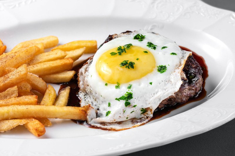 Бифштекс из мраморной говядины с жареным яйцом и соусом демиглас. Подается с картофелем фри и трюфельной пудрой