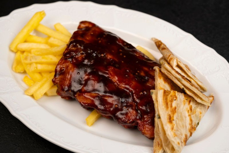 Свиные ребра су-вид, обжаренные на гриле. Подаются с картофелем фри и лепешкой роти