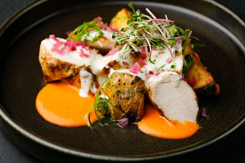 Шашлык из куриного филе. Подается с запеченным картофелем в соусе ромеско и сальсой из печеного перца