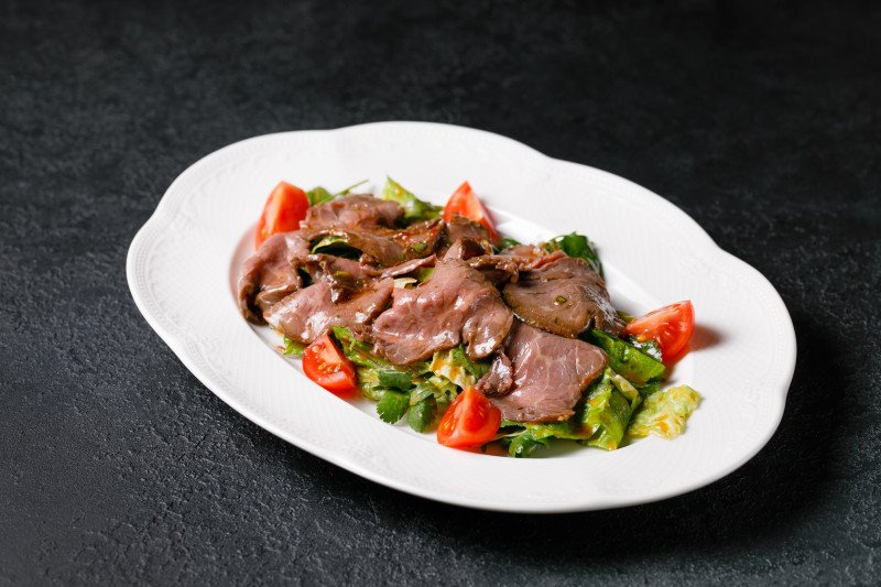 Ростбиф, руккола, кинза, салат Ромен, петрушка, томаты черри. Заправка на основе кунжутного соуса и хрустящего чили