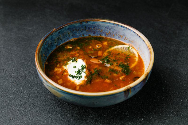 Суп с мясом и копченостями с добавлением маринованых огурцов и лимона. Подается со сметаной и зеленью