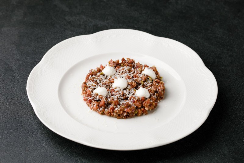 Тар-тар из мраморной говядины (сырое мясо). Подается с трюфельным айоли и тертым пармезаном