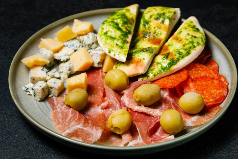 Салями, хамон, пармезан, дорблю, оливки, пита на гриле с соусом песто